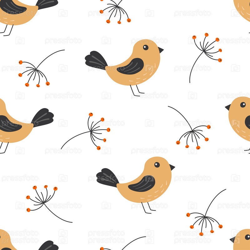 Бесшовный узор с милыми птицами и веточками с ягодами в мультяшном стиле. Птицы в лесу. Векторная иллюстрация