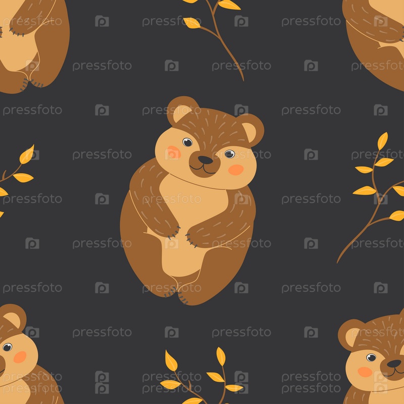 Бесшовный узор с милыми медведями и ветками с осенними листьями в мультяшном стиле. Животные в лесу. Векторная иллюстрация