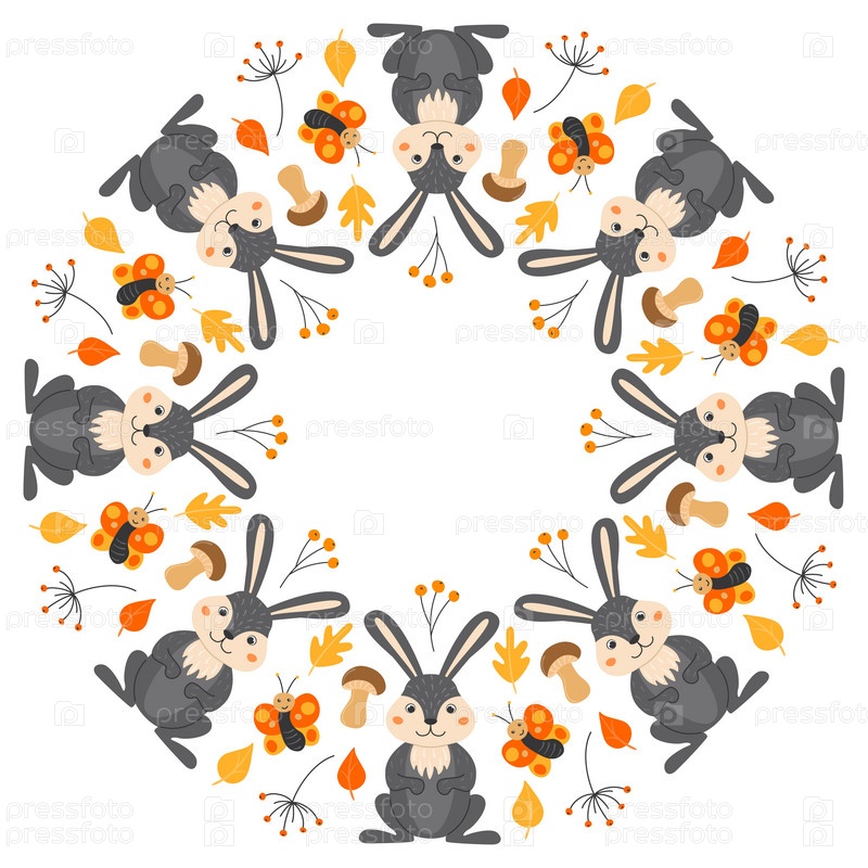 Векторная круглая рамка с милыми кроликами, бабочками, веточками и листьями в мультяшном стиле. Лесные животные и растения. Осень в лесу. Место для текста
