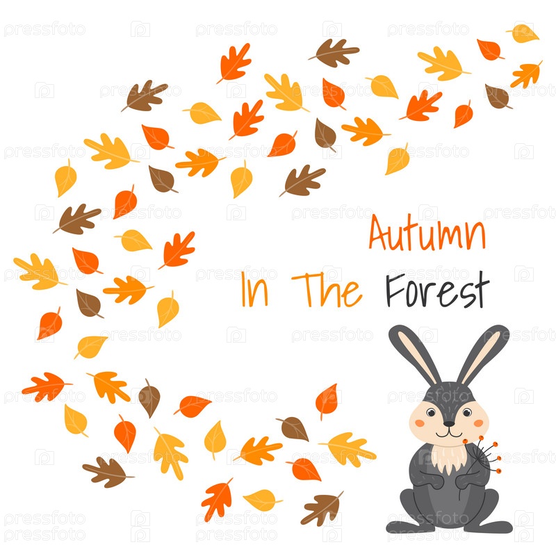 Векторная иллюстрация с милым кроликом и листопадом в мультяшном стиле. Лесные животные и растения. Осень в лесу