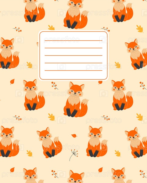 Дизайн обложки для блокнотов-планировщиков с изображением забавной лисы, осенних листьев и веточек. Векторная иллюстрация в мультяшном стиле