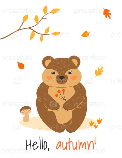 Векторная иллюстрация с милым медведем, грибом и листопадом в мультяшном стиле. Лесные животные и растения. Привет осень. Плакат формата А4