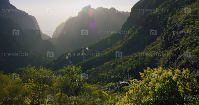 Красивый закат в долине Маска и ущелье, Тенерифе, Канарские острова, Испания. Солнечный свет пробивается сквозь горные хребты. Восхитительный вид. Ручная съемка высокого качества