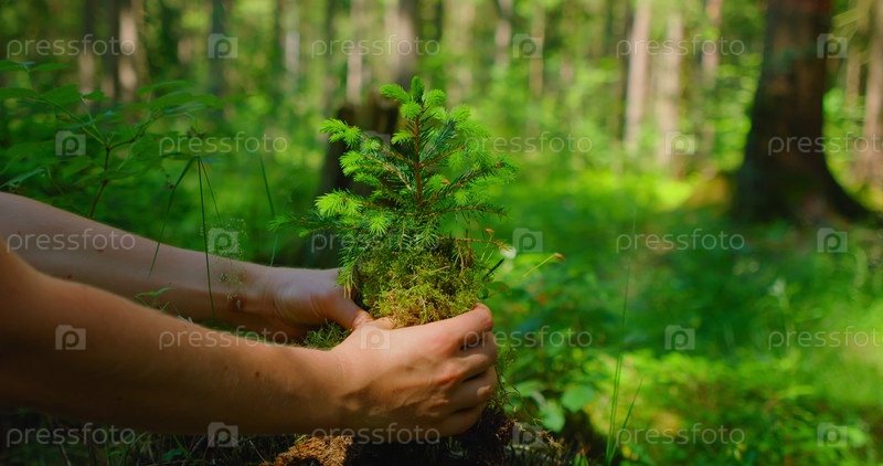 Женская рука держит росток сосны Уайльда в природе зеленом лесу. День Земли, концепция сохранения окружающей среды. Выращивание рассады лесных посадок
