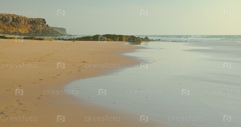 Легкие волны морской воды катятся по пляжу с влажным мягким песком и галькой на ярком закате вечером. Океанский пейзаж, расслабляющее настроение отпуска. Фуэртевентура, Канарские острова, Испания