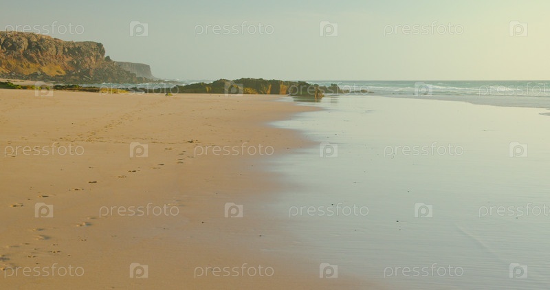 Легкие волны морской воды катятся по пляжу с влажным мягким песком и галькой на ярком закате вечером. Океанский пейзаж, расслабляющее настроение отпуска. Фуэртевентура, Канарские острова, Испания