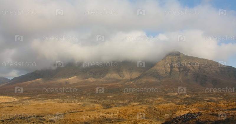 Национальный парк Бетанкурия на острове Фуэртевентура, Канарские острова, Испания. Захватывающий вид на живописный ландшафт пустыни. Вершины гор покрыты белыми облаками, туманом