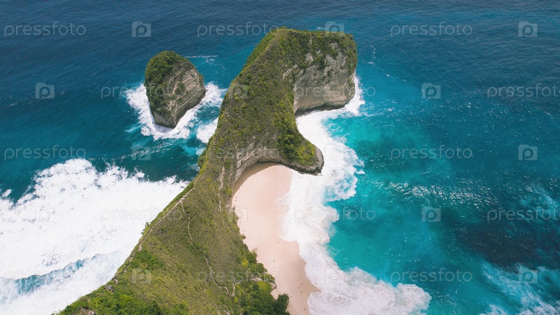 Песчаный пляж Келингкинг с высоким заросшим скалистым утесом и бирюзовым океаном Остров Нуса Пенида Бали. Вид сверху вниз на лучшее туристическое направление в Индонезии, Азии