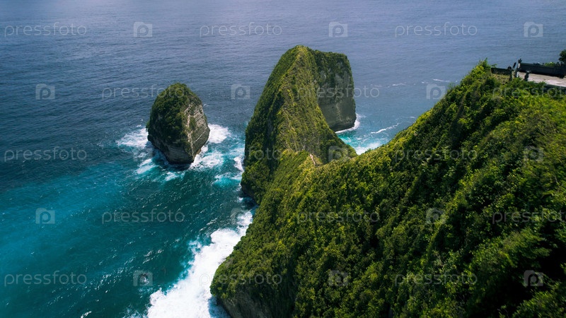 Вид с воздуха на пляж Келингкинг на острове Нуса Пенида, Бали. Знаменитая природная достопримечательность. Бирюзовая океанская вода у зеленых известняковых скал. Туристическая достопримечательность во время летних каникул