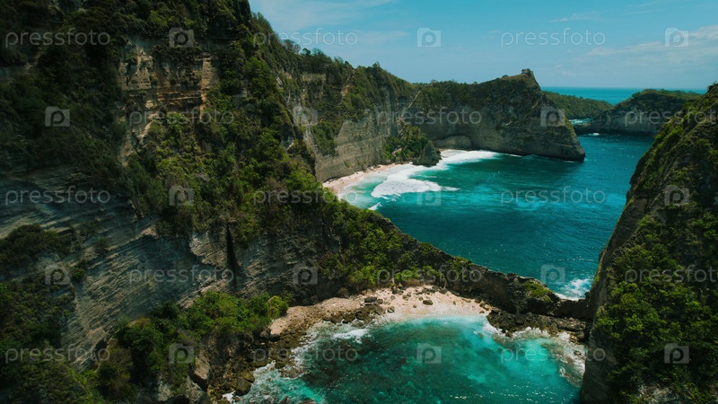 Нетронутый белый песчаный пляж Даймонд на Нуса Пенида, Бали, Индонезия. Океанские волны на скалистом побережье с туристами, отдыхающими в отпуске