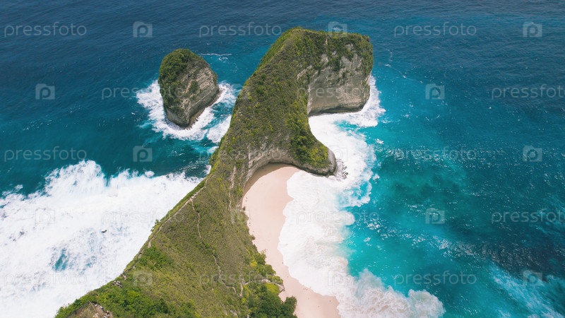 Песчаный пляж Келингкинг с высоким заросшим скалистым утесом и бирюзовым океаном Остров Нуса Пенида Бали. Вид сверху вниз на лучшее туристическое направление в Индонезии, Азии