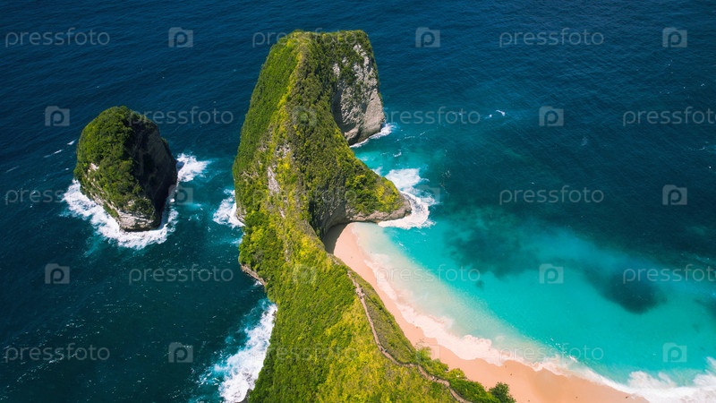Нетронутый песчаный пляж Келингкинг на острове Нуса Пенида, Бали. Бирюзовая океанская вода у зеленых известняковых скал. Знаменитая природная достопримечательность