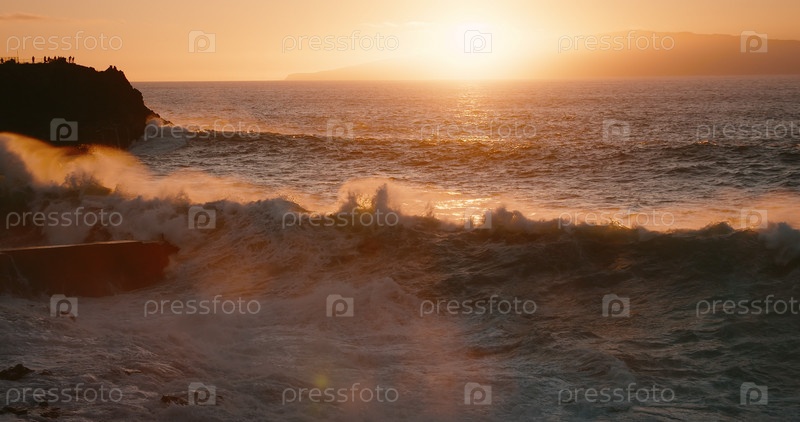 Драматические бурные океанские волны разбиваются о скалистую береговую линию в городе Пуэрто-Сантьяго на золотом закате в замедленной съемке. Брызги морской воды разбрызгиваются высоко в воздух и ударяются о пирс крупным планом. Тенерифе Канарские острова
