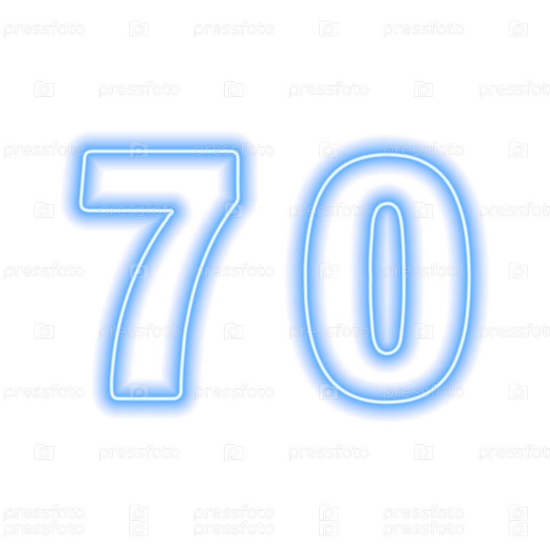 Неоново-синий номер 70 изолирован на белом. Серийный номер, цена, место