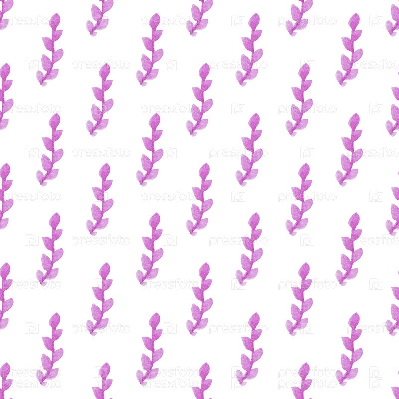 Бесшовный узор с нарисованными вручную акварельными фиолетовыми ветвями с листьями на белом. Лето, весенний сезон