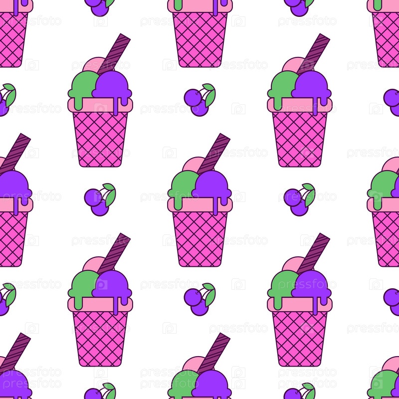 Бесшовный узор с цветными шариками мороженого в фиолетовом вафельном стакане и ягодами на белом фоне. Ярко-зеленый, розовый, фиолетовый