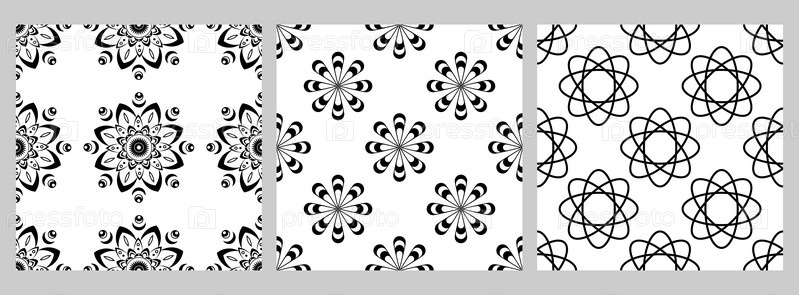 Набор геометрических бесшовных узоров с шахматными фигурами. Черные фигуры на белом фоне. Мандалы, цветы