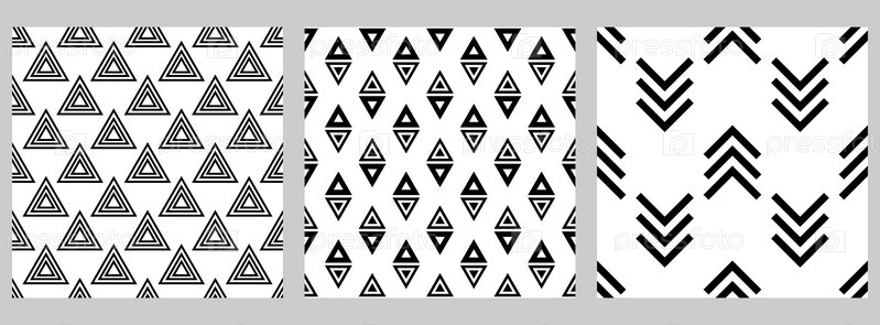 Набор геометрических бесшовных узоров с шахматными фигурами. Черные фигуры на белом фоне. Треугольники, стрелки, линии, углы
