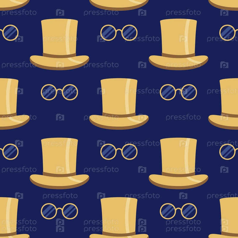 Бесшовный узор со стильными винтажными мужскими аксессуарами: цилиндром, очками. Модные темно-синие и золотистые цвета