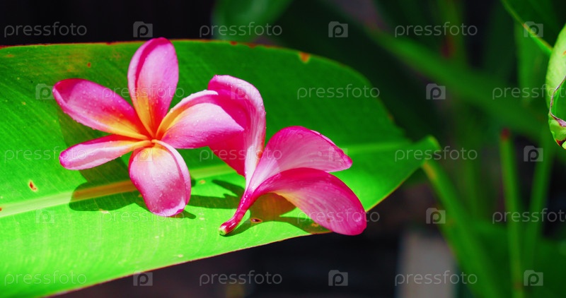 Зеленая пальмовая ветвь тропического леса с мокрыми опавшими цветами плюмерии крупным планом. Яркая растительность розовых экзотических деревьев и кустов франжипани на острове Бали. Природный пейзаж тропического леса. Индонезия Азия. Съемка с рук