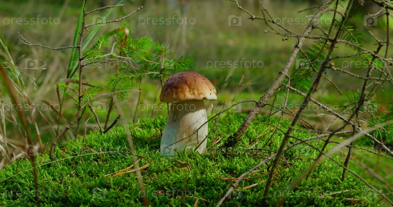 Белый гриб, растущий в диком хвойном лесу. Белый гриб. Съедобные грибы. Грибник закрывает отверстие во мхе, чтобы защитить мицелий. Экологически чистая продукция. Никто. Крупный план