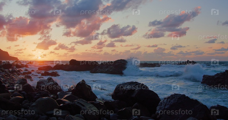 Океанские волны разбиваются о каменные скалы на севере острова Тенерифе. Волны разбиваются о черные камни на закате. Пенящиеся голубые океанские волны. Никто