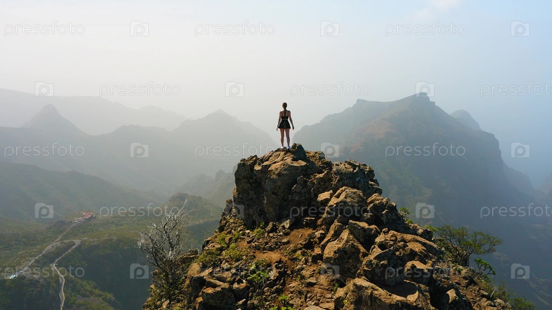 Воздушная съемка с дрона женщины-туристки наслаждается пейзажами зеленых гор. Молодая туристка стоит на вершине скалы. Время путешествовать. Ходите повсюду. Сила женщин. Сила девушек