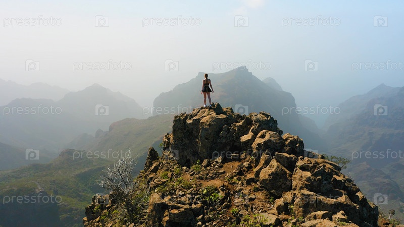 Воздушная съемка с дрона женщины-туристки наслаждается пейзажами зеленых гор. Молодая туристка стоит на вершине скалы. Время путешествовать. Ходите повсюду. Сила женщины. Сила девушек. Вершины холмов в туманной дымке