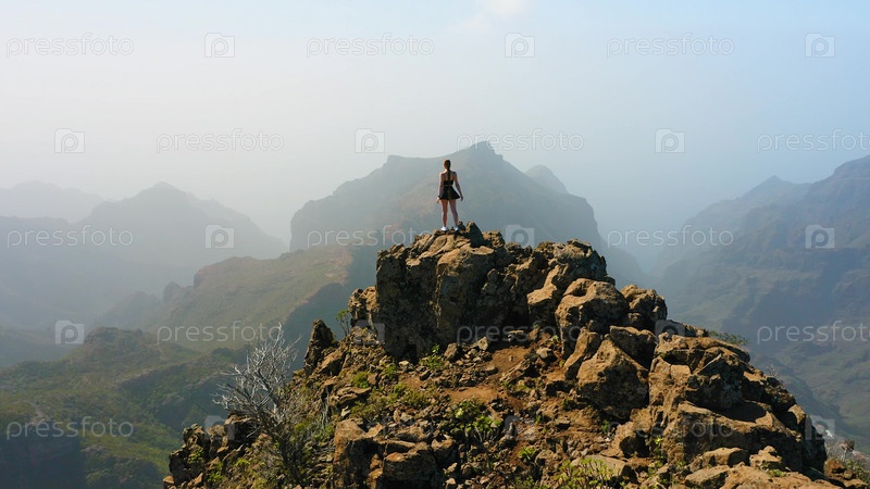 Воздушная съемка с дрона женщины-туристки наслаждается пейзажами зеленых гор. Молодая туристка стоит на вершине скалы. Время путешествовать. Ходите повсюду. Сила женщин. Сила девушек