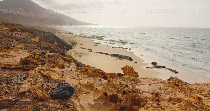 Пляж Кофете с бесконечным горизонтом и следами на песке. Вулканические холмы на заднем плане и Атлантический океан. Пустынный пейзаж природы, Фуэртевентура, Канарские острова, Испания. Песчаник, ветер рисует причудливые формы