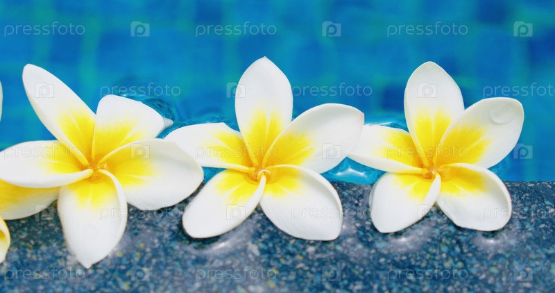 Тропические белые цветы франжипани на фоне голубой воды. Вид сверху, плоская планировка. Край бассейна. Нежные растения. Релаксация. Крупный план