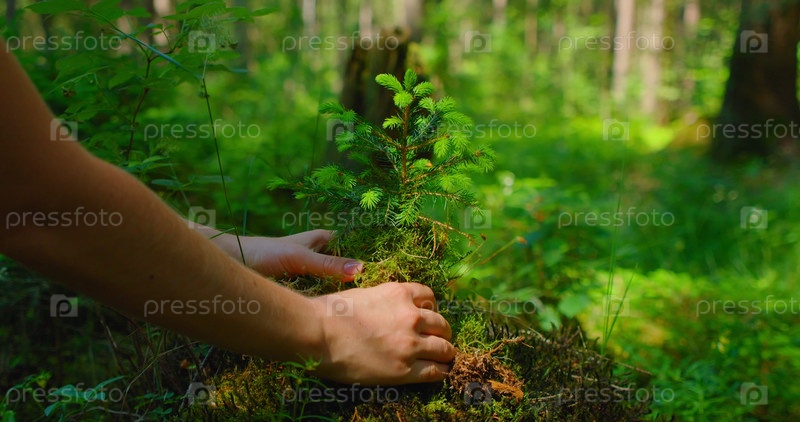 Женская рука держит росток сосны Уайльда в природе зеленом лесу. День Земли, концепция сохранения окружающей среды. Выращивание саженца лесника. Защита мира планеты