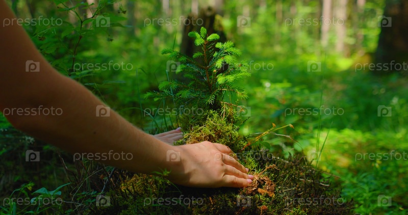 Женская рука держит росток сосны Уайльда в природе зеленом лесу. День Земли, концепция сохранения окружающей среды. Выращивание саженца лесника. Защита мира планеты