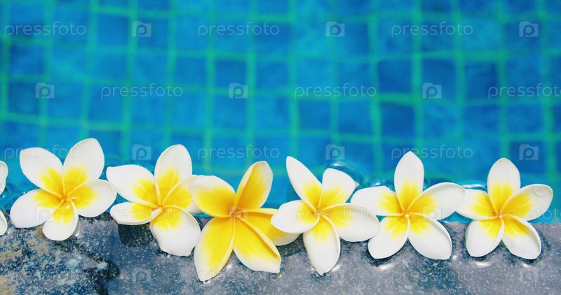Тропические цветы франжипани плюмерия, плавающие в воде. Спа-бассейн. Концепция мира и спокойствия. Остров Бали, Индонезия. Крупный план