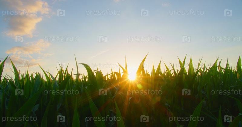 Мерцающие солнечные лучи за стеблями кукурузного поля, крупный план растений кукурузы с солнечной подсветкой. Солнечные лучи освещают листву. Зеленые молодые початки кукурузы на фоне закатного неба