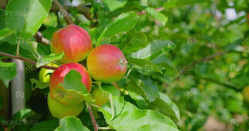 На ветке в саду висят красные яблоки. В саду созревают яблони с розовыми яркими плодами. Ветер трясет зелеными листьями. Крупный план высокого качества в формате 4k. Никто