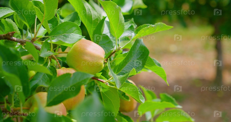Незрелые зеленые яблоки на ветке дерева. Незрелый фруктовый сад или яблоневый сад. Год урожая. Солнечный день. Ветреная погода. Крупный план, замедленная съемка. Никто