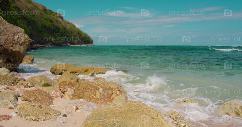 Красивая береговая линия тропического пляжа Грин Боул Бали с кристально чистым лазурным океаном и волнами на фоне природы. Скалистый берег моря с белым песком. Никто. Расслабляющий вид
