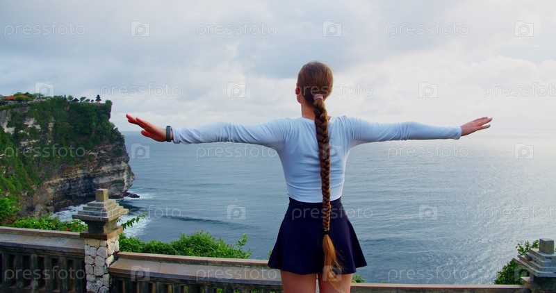 Женщина с длинной косой наслаждается видом на океан в индуистском храме Улувату на острове Пура Бали, Индонезия. Вид сзади на туристку, отдыхающую на каменистом пляже. Отвесные известняковые скалы и лазурные воды Индийского океана