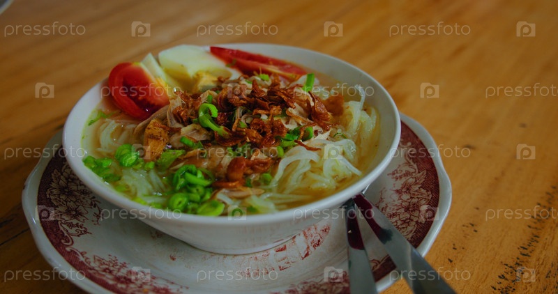 Тарелка супа сото аям содержит куриную лапшу, овощи, яйцо, зелень. Тарелка с вкусным блюдом, традиционной индонезийской едой. Селективный фокус. Крупный план, замедленная съемка