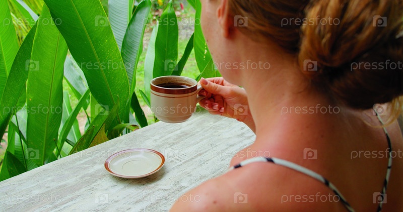 Женщина нюхает и пытается пить горячий кофе копи лювак, наслаждаясь природой зеленого тропического сада. Крупным планом вид сзади на одинокую девушку-путешественницу на острове Бали Нуса Пенида, Индонезия. Крупный план, замедленная съемка