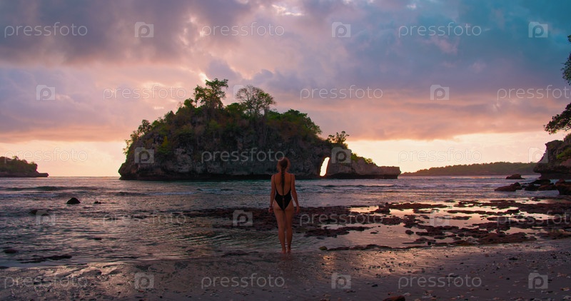 Красивый закат над горным островом Кристал Бэй Бич Нуса Пенида на заднем плане одинокой женщины в купальнике, идущей вдоль океанских волн. Оранжевый свет отражается на поверхности воды. Спокойные морские волны разбиваются о песчаный берег. Статическая зам