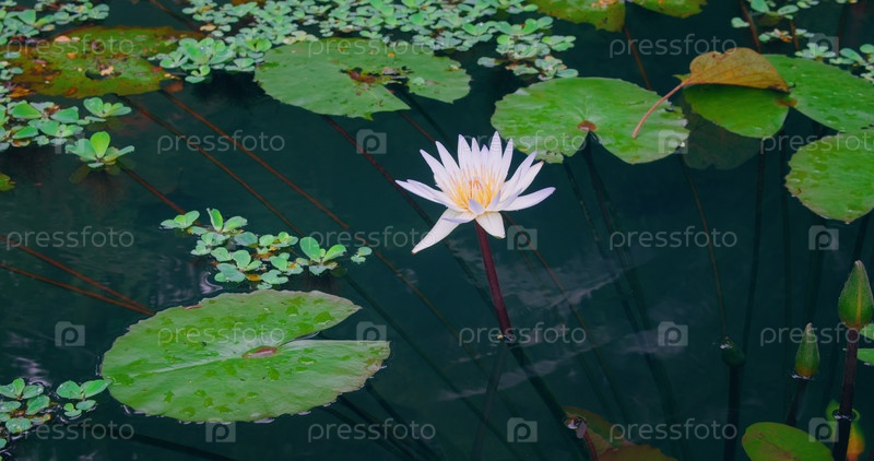 Розовый цветок водяной лилии лотоса и зеленые листья в пруду с водой на Бали, Индонезия