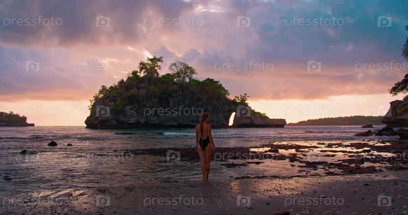 Красивый закат над горным островом Кристал Бэй Бич Нуса Пенида на заднем плане одинокой женщины в купальнике, идущей вдоль океанских волн. Оранжевый свет отражается на поверхности воды. Спокойные морские волны разбиваются о песчаный берег. Статическая зам