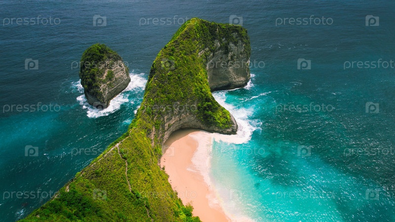 Вид с воздуха на пляж Келингкинг на острове Нуса Пенида, Бали. Знаменитая природная достопримечательность. Бирюзовая океанская вода у зеленых известняковых скал. Туристическая достопримечательность во время летних каникул