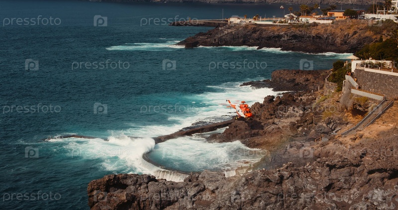 Медицинский вертолет приземляется на скалистый вулканический берег для спасательной операции. Авиация оказывает первую помощь пострадавшим. Бурный океанский пляж. Тенерифе Канарские острова Испания Европа. Скалы Лос-Гигантес
