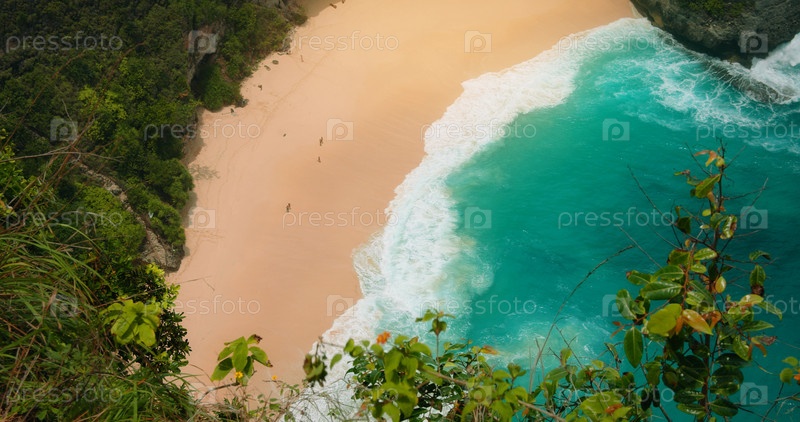 Океанские волны катятся по золотому песчаному пляжу Келингкинг на закате в Бали Нуса Пенида, Индонезия. Нетронутый тропический пейзаж в замедленной съемке