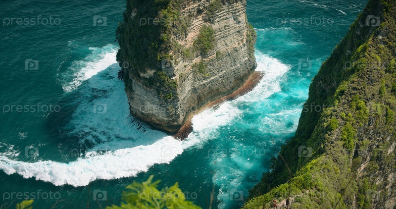 Зеленый мыс на тропическом нетронутом острове Нуса Пенида - пляж Келингкинг с бирюзовым океаном в Индонезии. Скала Палуанг
