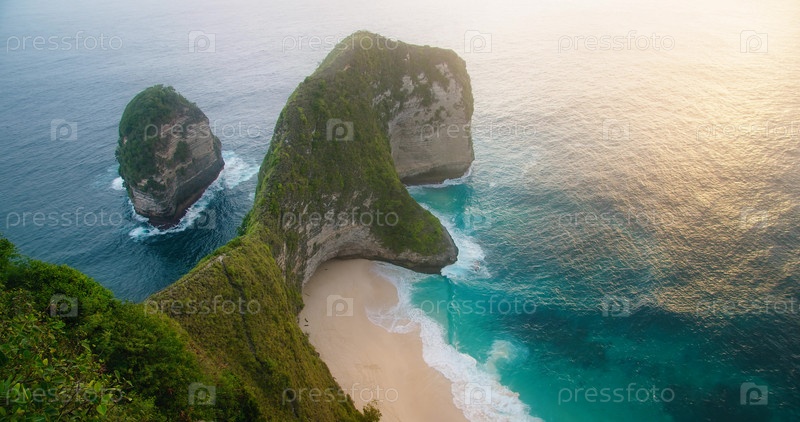 Капли дождя на пляже Келинкинг в Нуса-Пенида, Индонезия. Потрясающий океанский пейзаж с зеленой скалой на берегу. Высококачественные кадры 4K в замедленном режиме крупного плана