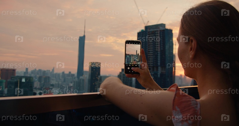 Привлекательная брюнетка держит в руках телефон и фотографирует вечерний город. На открытом воздухе на террасе с современными высотными зданиями. Концепция путешествия повсюду
